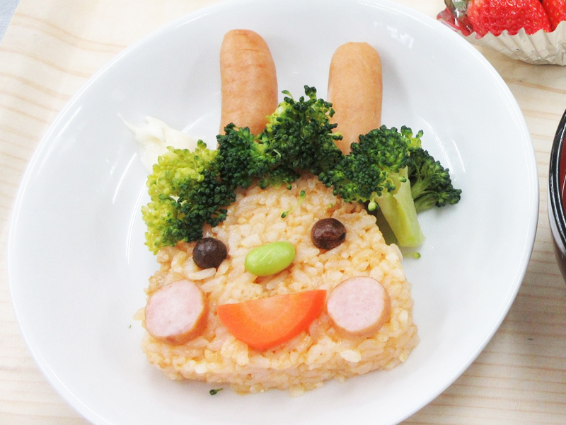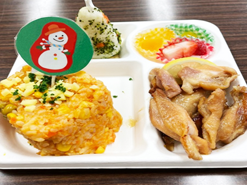 クリスマスプレートでは、チキンのロースト、彩りピラフ、ツリー風おにぎり、フルーツとデザートを盛り合わせ、見た目も楽しい特別メニューでした!